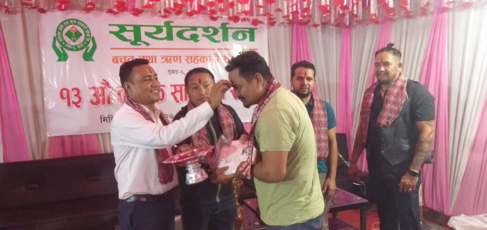 दमक/ दमकस्थित सूर्यदर्शन बचत तथा ऋण सहकारी संस्थाले १३ औं बार्षिक साधारण सभा औपचारिक रुपमा समापन गरेको छ । सोमबारदेखि शुरु भएको साधारण सभा आज शुक्रबार मोवाइल बैंकिगंको उपयोग गर्ने उत्कृष्ट सदस्यहरुलाई सम्मान गर्दै समापन भएको हो ।