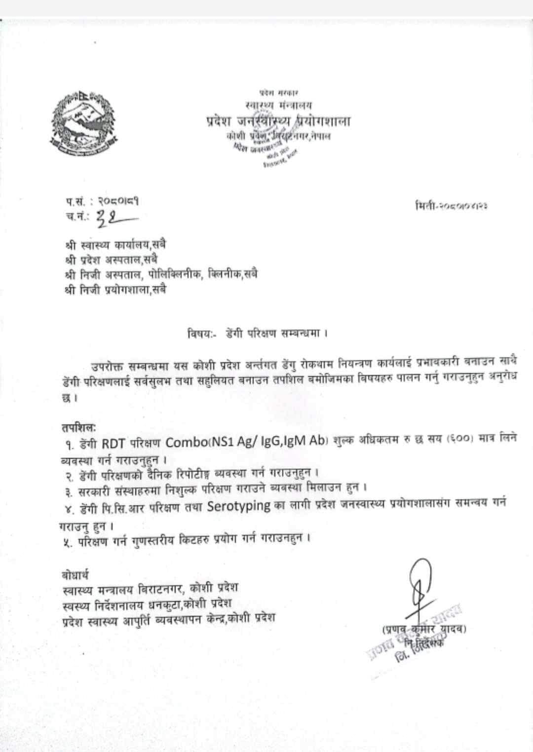 प्रदेश सरकार स्वास्थ्य मन्त्रालय अन्तर्गतको प्रदेश जनस्वास्थ्य प्रयोगशाला विराटनगरले प्रदेशभरका सामुदायिक तथा निजी स्वास्थ्य संस्थाहरुलाई मंगलबार पत्राचार गर्दै डेंगी परिक्षण शुल्क अधिकतम ६०० रुपैयाँ मात्र लिन भनेको छ । कार्यालयले प्रदेश अन्तर्गतका स्वास्थ्य कार्यालयहरु, प्रदेश अस्पताल, निजी अस्पताल, पोलिक्लिनिक , क्लिनिकहरु र निजी प्रयोगशालाहरुलाई डेंगी परिक्षण शुल्क अधिकतम ६०० रुपैयाँ मात्रै तोकेको हो ।