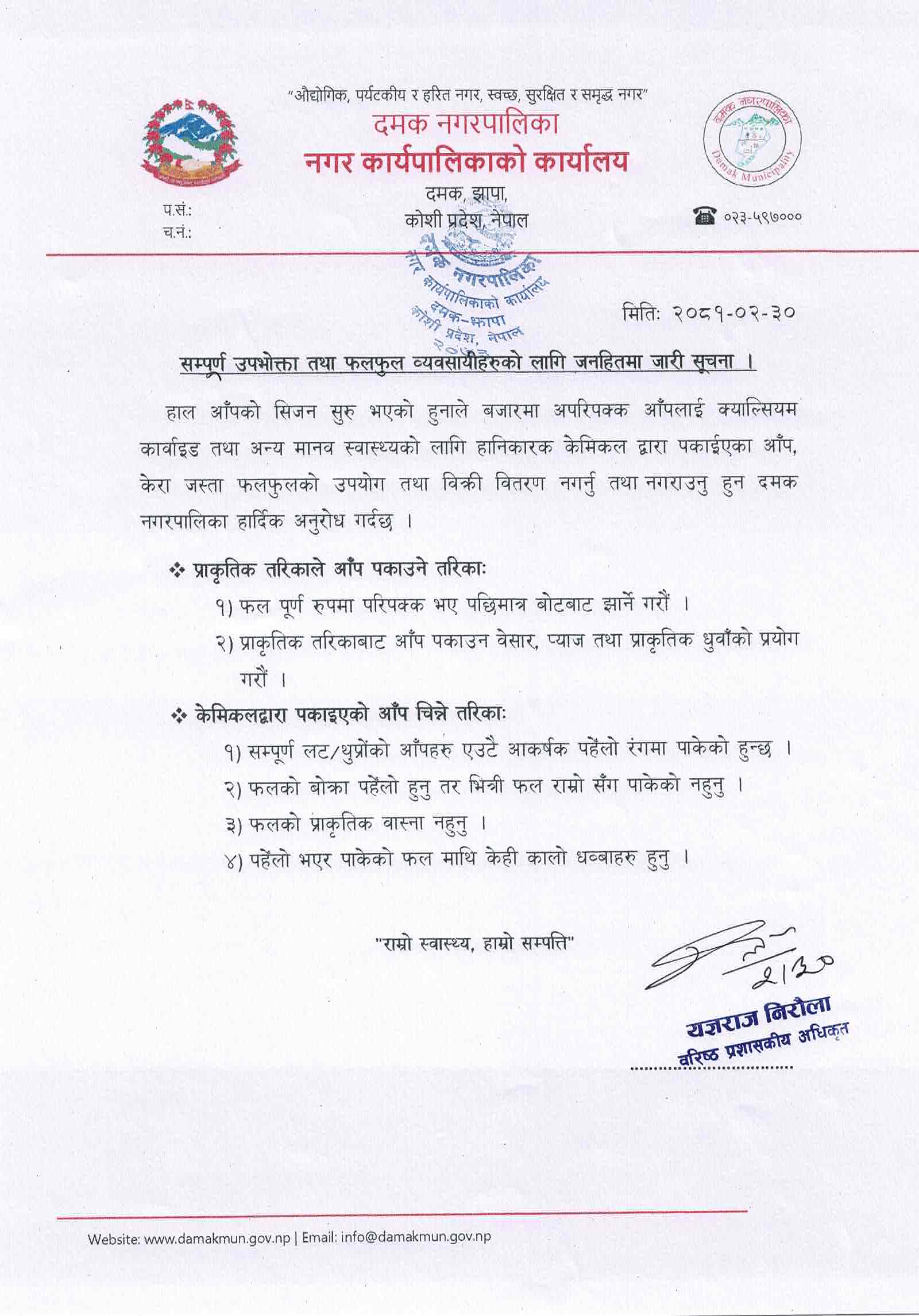 विशेष गरी अहिले बजारमा निस्किएको आँप र केरालाई लक्षित गर्दै दमक नगरपालिकाले त्यस्तो सचेत गराएको हो ।