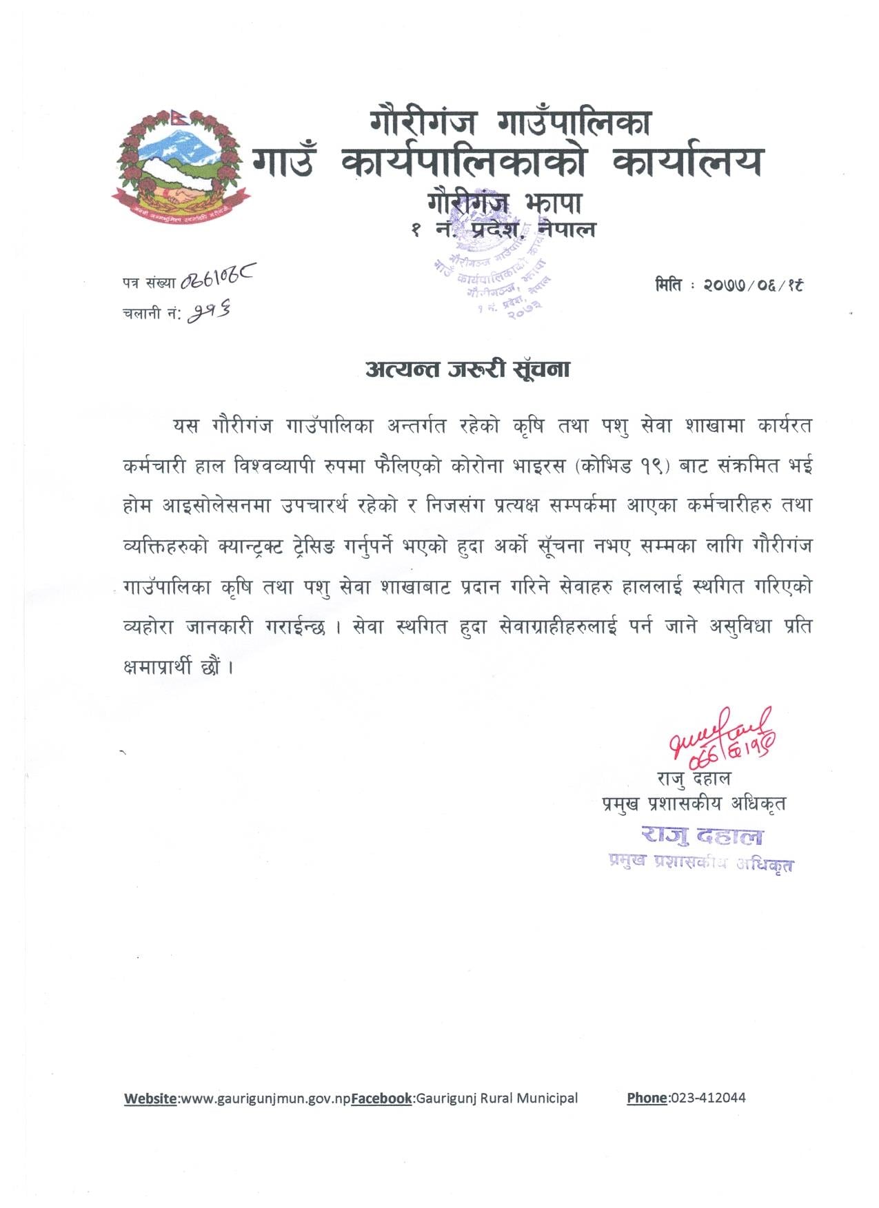 सो शाखामा कार्यरत एक जना कर्मचारीमा कोरोना संक्रमण देखिएपछि शाखाको सेवा बन्द गरिएको प्रमुख प्रशासकिय अधिकृत राजु दाहालले हस्ताक्षर गरेर आज सोमबार जारी गरेको सूचनामा उल्लेख छ । सूचनामा ति कर्मचारीसंग सम्पर्क जोडिएका व्यक्तिहरुको कन्ट्रयाक ट्रेसिङ गर्नु पर्ने भएकाले सो शाखा अर्को सूचना नभए सम्मका लागि स्थगित गर्नुपरेको जनाइएको छ । कोरोना संक्रमित ति कर्मचारी गौरीगञ्ज २ कोरोबारीका हुन । उनी होमआइसोलेसनमा उपचाररत रहेका पनि गाउँपालिकाले जनाएको छ । गौरीगञ्जको २ नम्बर वडा कार्यालयले भने संक्रमण फैलिन सक्ने खतरा हुन सक्ने भन्दै आंशिक लकडाउन समेत गरेको छ ।