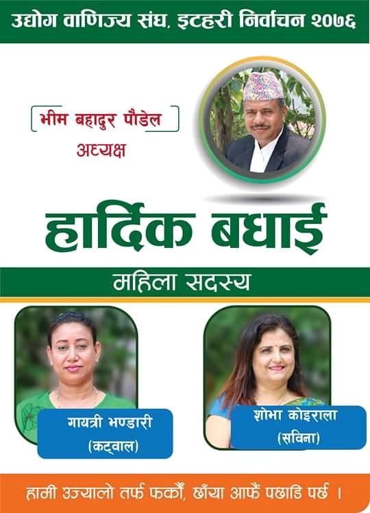 इटहरी /इटहरी उद्योग वाणिज्य संघमा लोकतान्त्रिक व्यवसायीको प्यानलबाट उम्मेद्वार बनेका व्यवसायी नेता भीम बहादुर पौडेल अध्यक्षमा भारी मतान्तरले विजयी