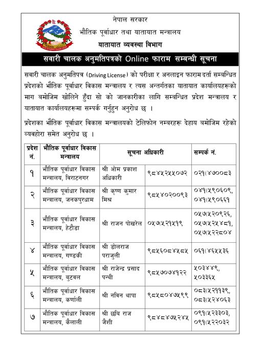 दमक/ भौतिक पूर्वाधार तथा यातायात मन्त्रालय, यातायात व्यवस्था विभागले झण्डै ९ महिनापछि सवारी चालक अनुमतिपत्र ( लाइसेन्स)को अनलाइन आवेदन खुलाएको