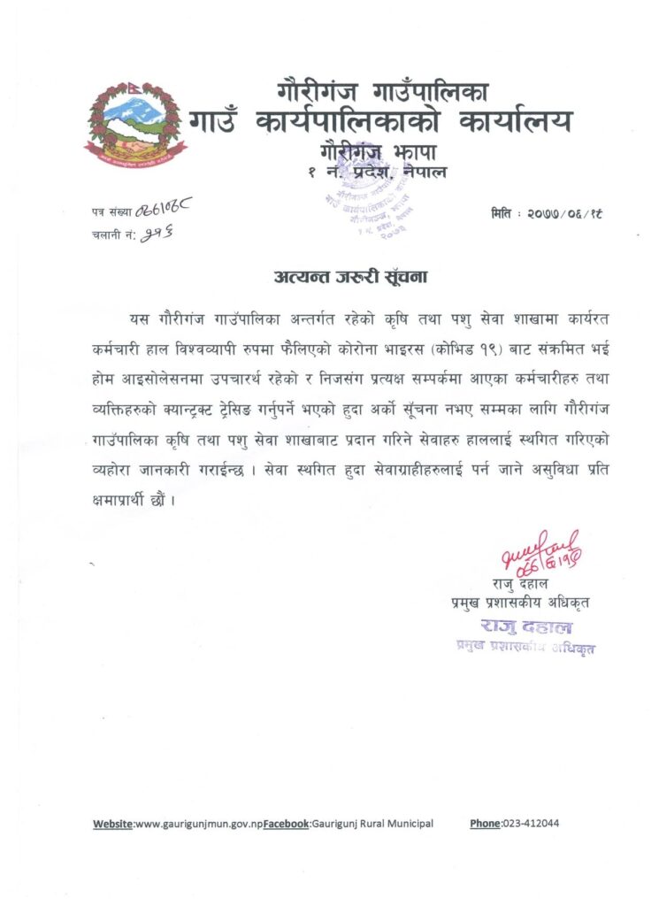 दमक/ झापाको गौरीगञ्ज गाउँपालिका अन्तर्गतको कृषि तथा पशु सेवा शाखा आजदेखि अनिश्चित कालका लागि बन्द भएको छ । सो शाखामा
