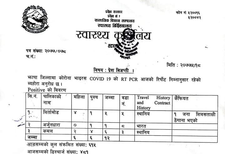 दमक/झापामा आज कूल १२ जना कोरोना संक्रमित थपिएका छन् । जिल्ला स्वास्थ्य कार्यालय झापाका अनुसार जिल्लाको कमल गाउँपालिकामा ६, विर्तामोड