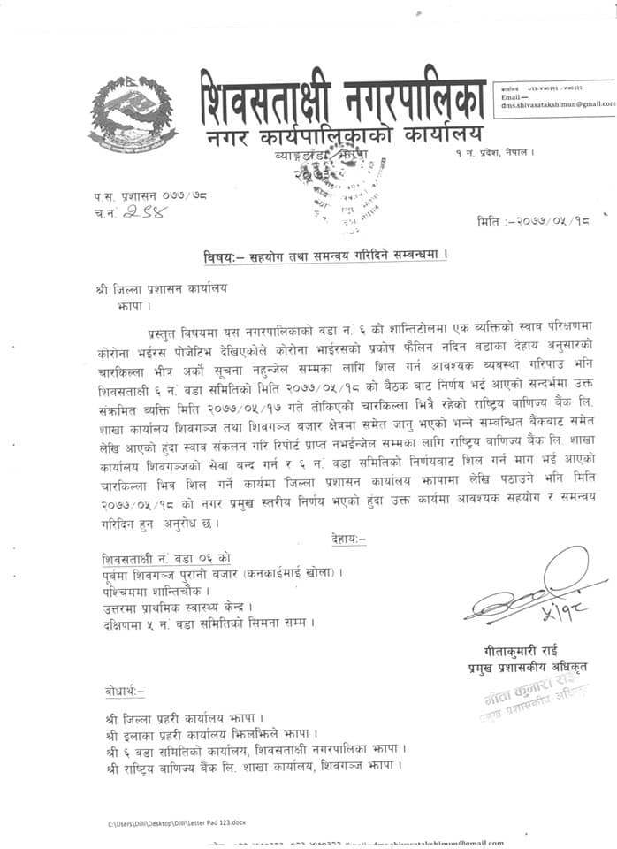दमक/ समुदायकी एक महिलामा कोरोना भाइरसको संक्रमण देखिएपछि झापाको शिवसताक्षी नगरपालिका वडा नं ६ मा तत्कालका लागि आवतजावत बन्द गरिएको