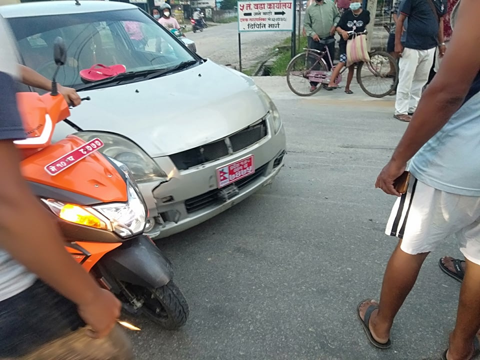 दमक/ झापाको दमक ५ भृकुटी चोकमा भर्खरै एउटा कारले मोटरसाइकल र एउटा स्कुटरलाई ठक्कर दिएको छ । अहिले साँझ ६.१०