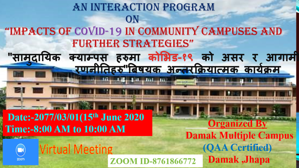 दमक/ पूर्वका सामुदायिक क्याम्पसहरुबीच कोभिड १९ र यसले सामुदायिक क्याम्पसमा परेको असर र आगामी चुनौतीका बिषयमा अन्तरक्रियात्मक छलफल भएको छ